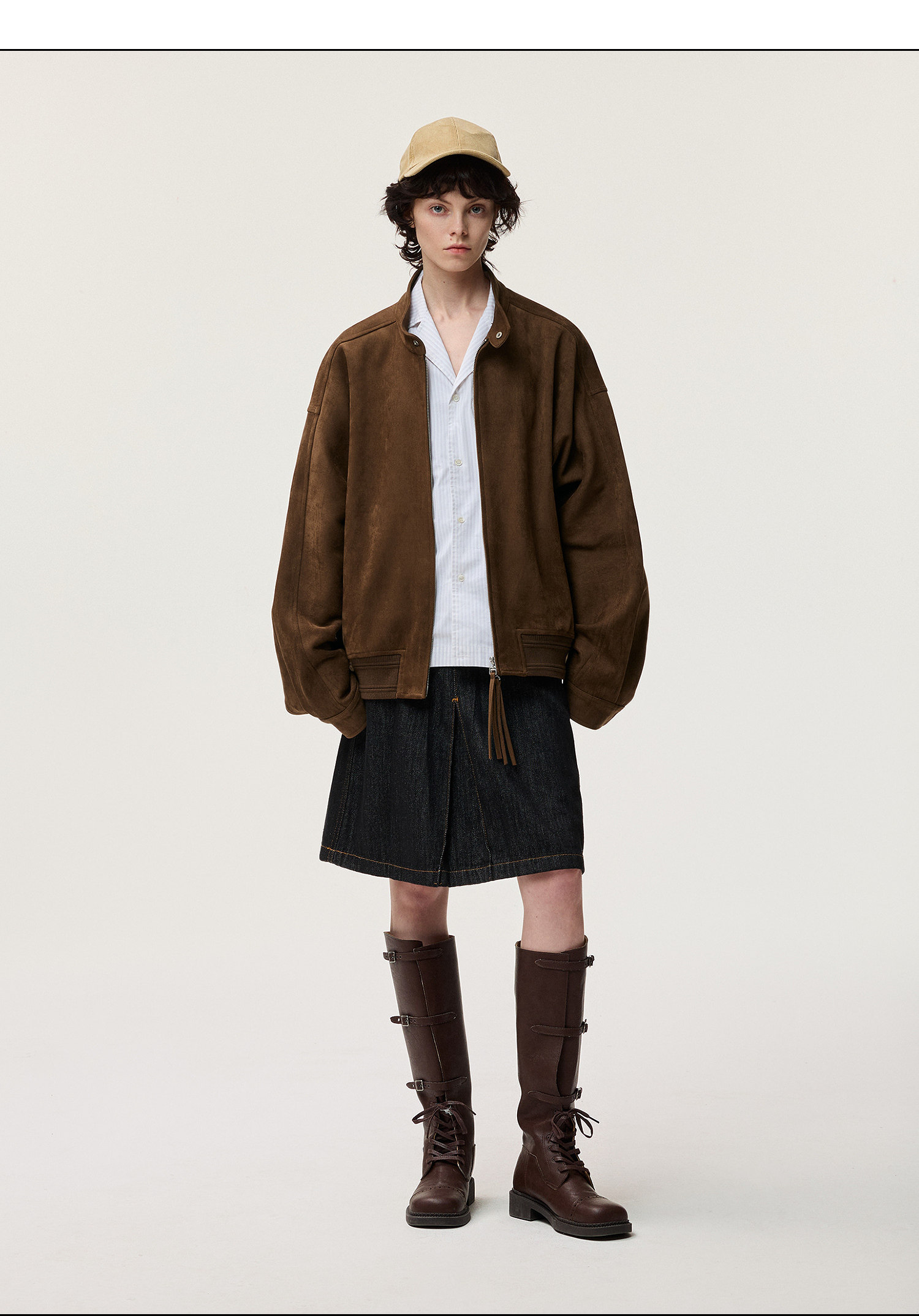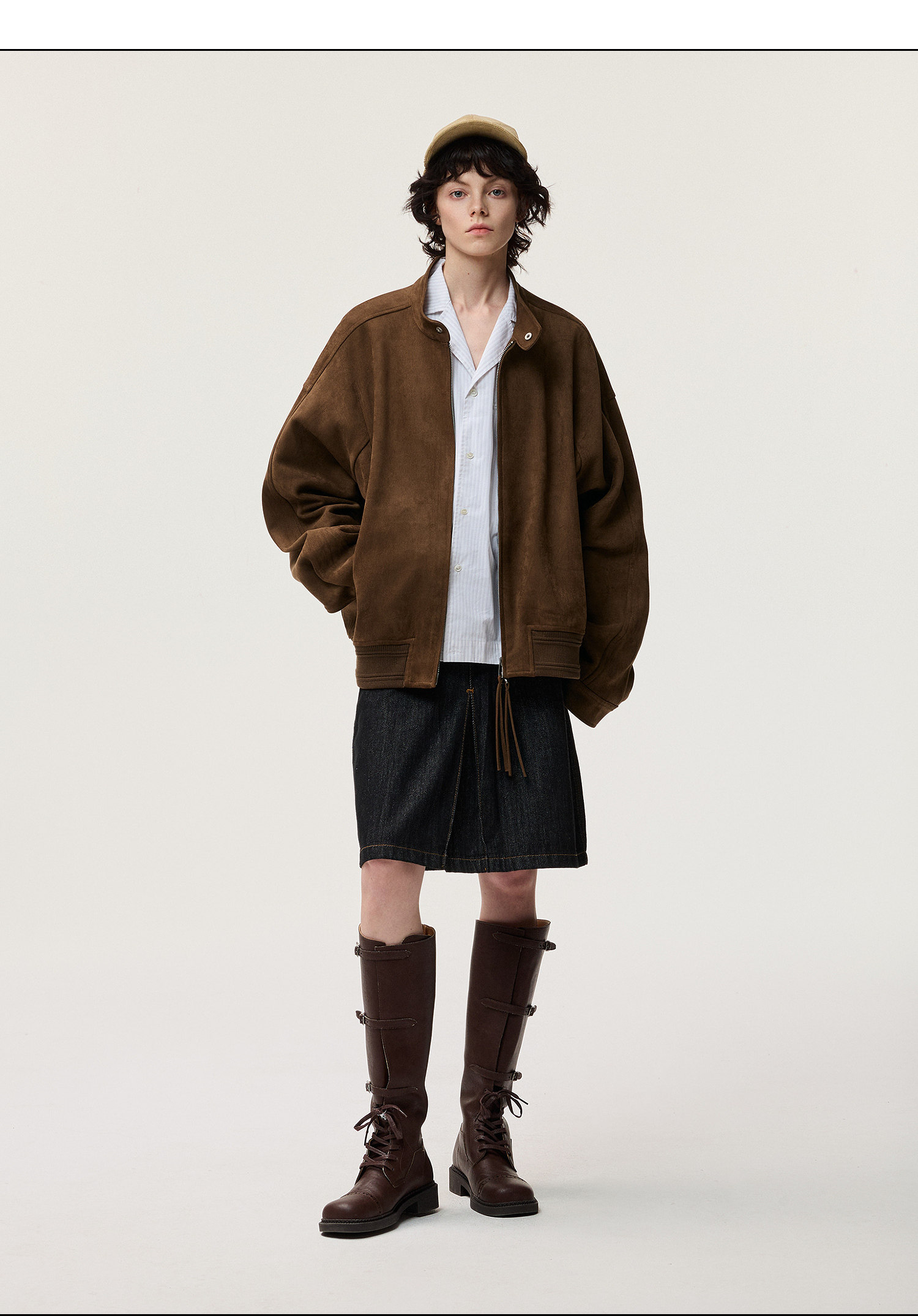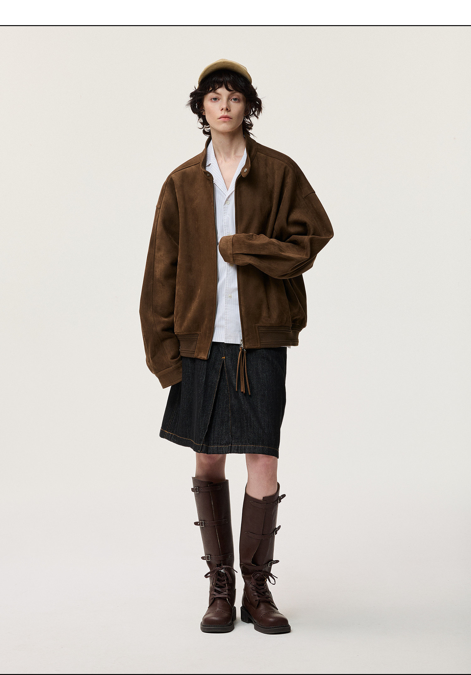 Featuring the classic Harrington stand collar, this jacket combines a relaxed silhouette with an elasticated hem for a sharp, tailored look that enhances your posture. The dual-zipper front closure is accented with pull tabs, striking a balance between functionality and playful detail. Breaking away from conventional designs, the raglan sleeves are paired with curved darting and top-entry pockets, offering minimalist yet thoughtful styling. Crafted from a cow suede and faux tiger fur composite fabric, it feels smooth to the touch and boasts a subtle sheen, ensuring a structured and polished fit. Custom-grade double-knitted ribbing highlights the premium quality.