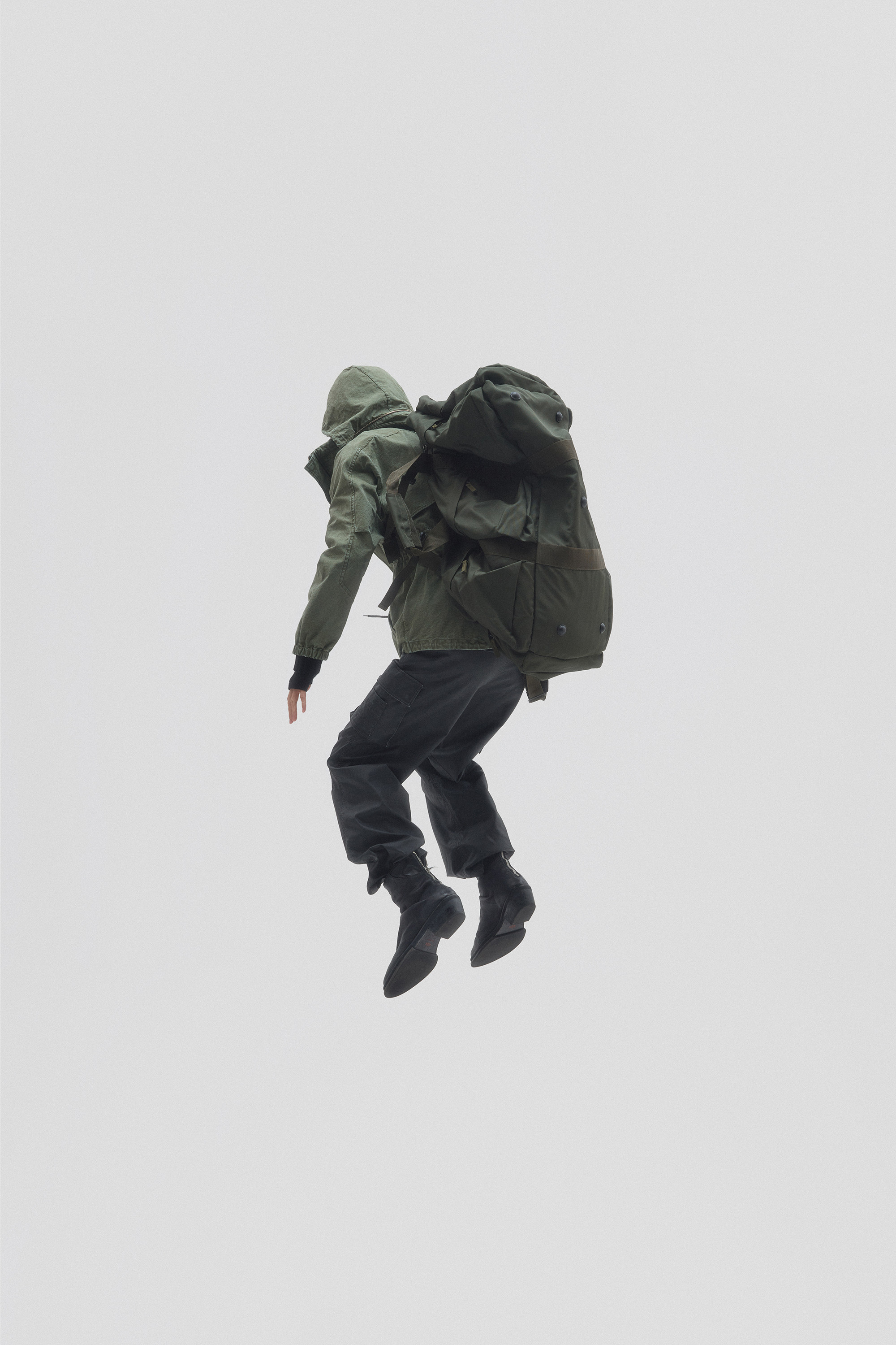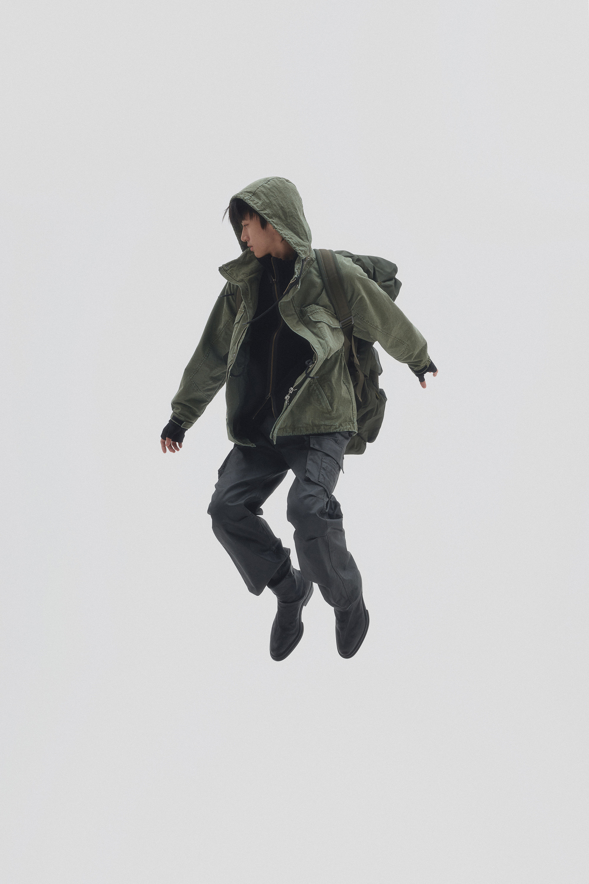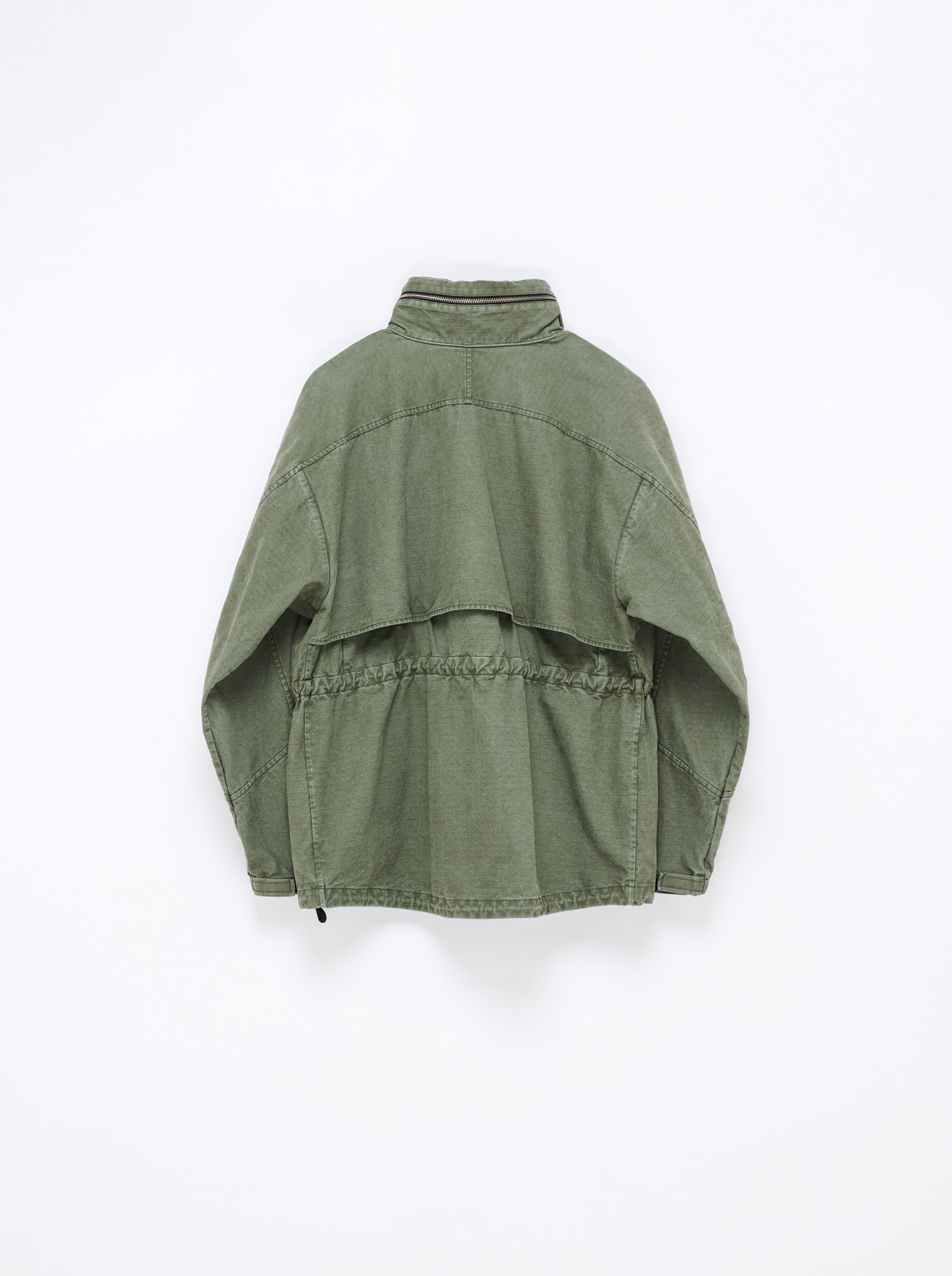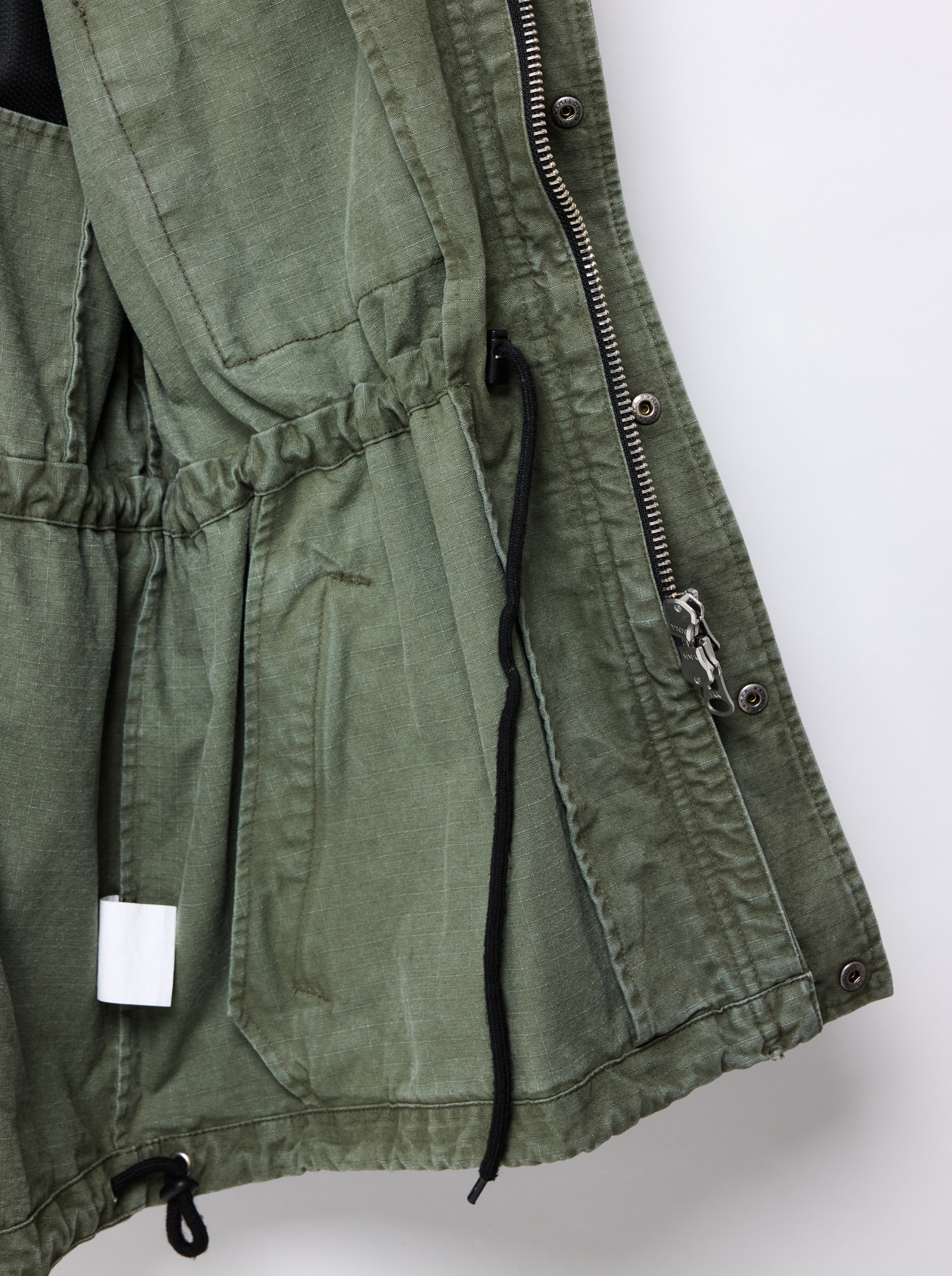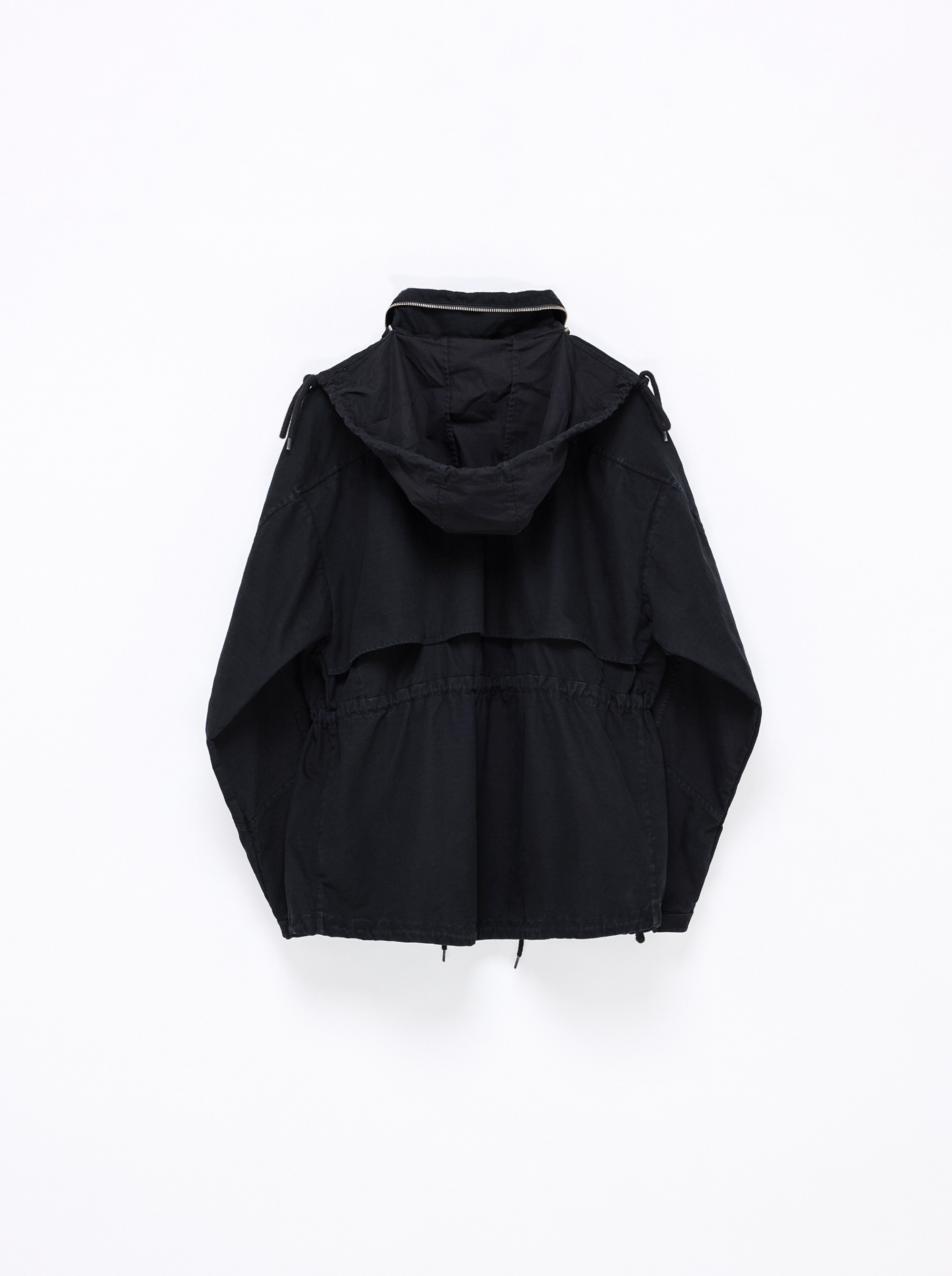Adjustable drawstrings at the waist and hem allow you to customize the shape, while the attached hood can be neatly tucked away when not in use. Made from thick, structured fabric, this piece offers exceptional durability and a sharp, sculpted silhouette that holds its shape effortlessly.