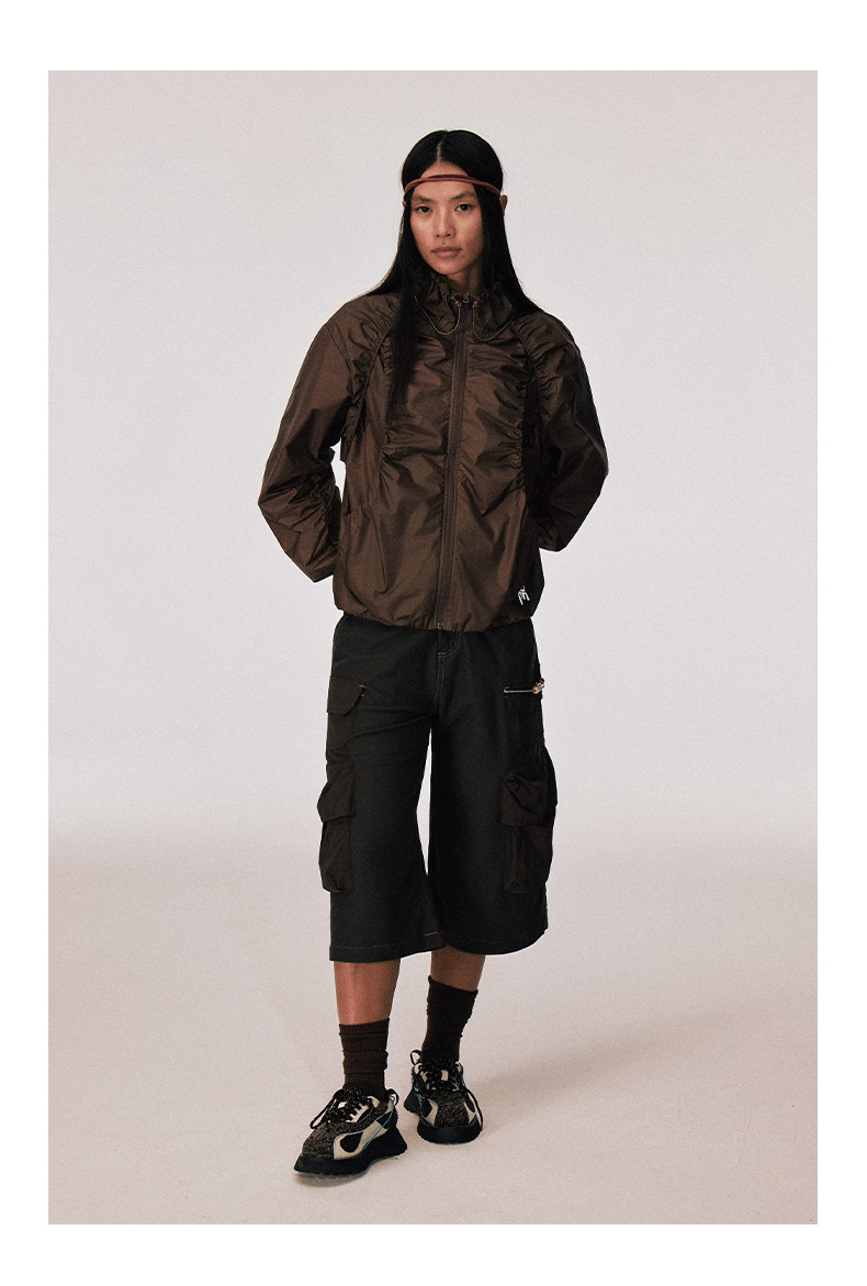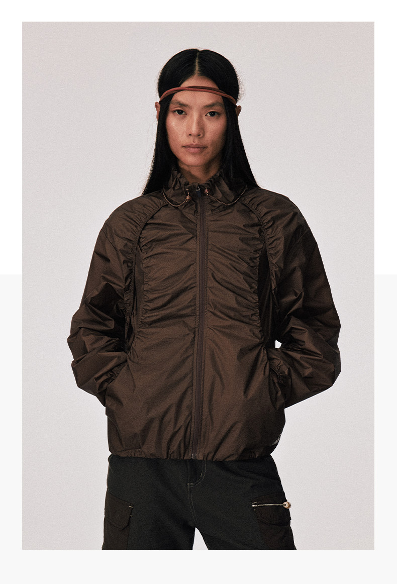 Women's brown oversized jacket - smocked ruched detail long sleeve zip up mandarin collar