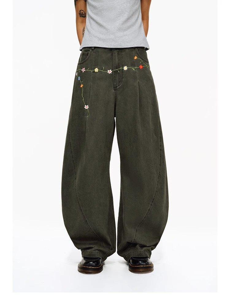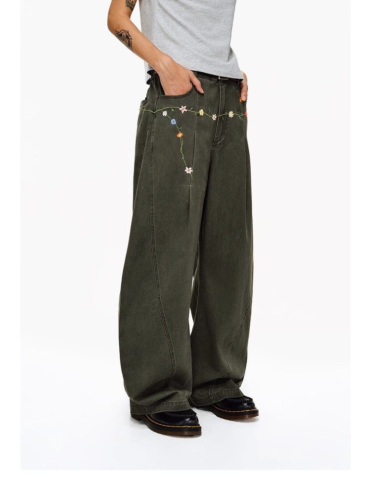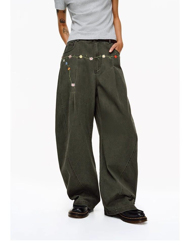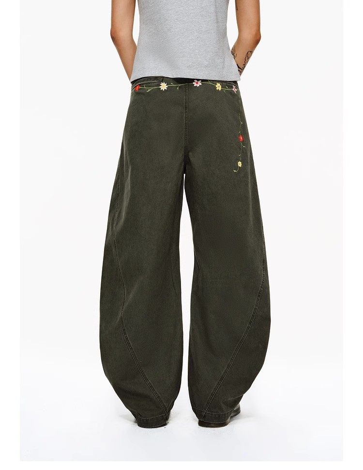 Features delicate floral embroidery details at the waist, adding a touch of refined artistry and making these pants a standout piece in any casual collection.