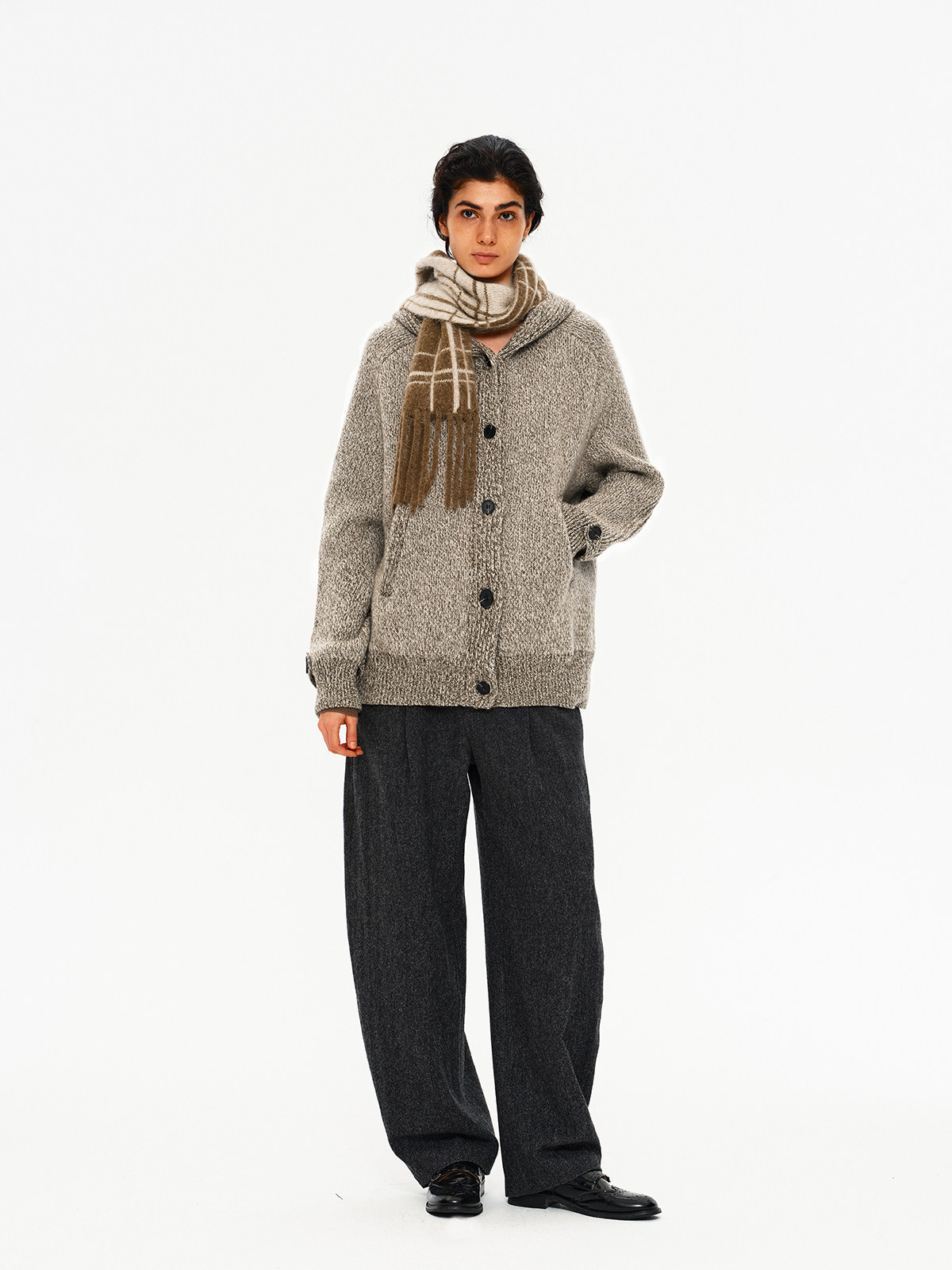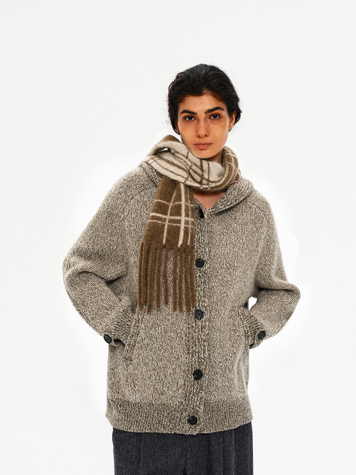 Featuring a timeless check pattern on both sides and a unique open-work detail, it allows for versatile styling to elevate any outfit. Discover the perfect blend of cozy function and minimalist design.