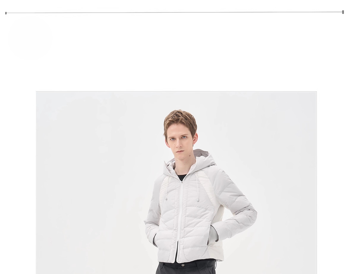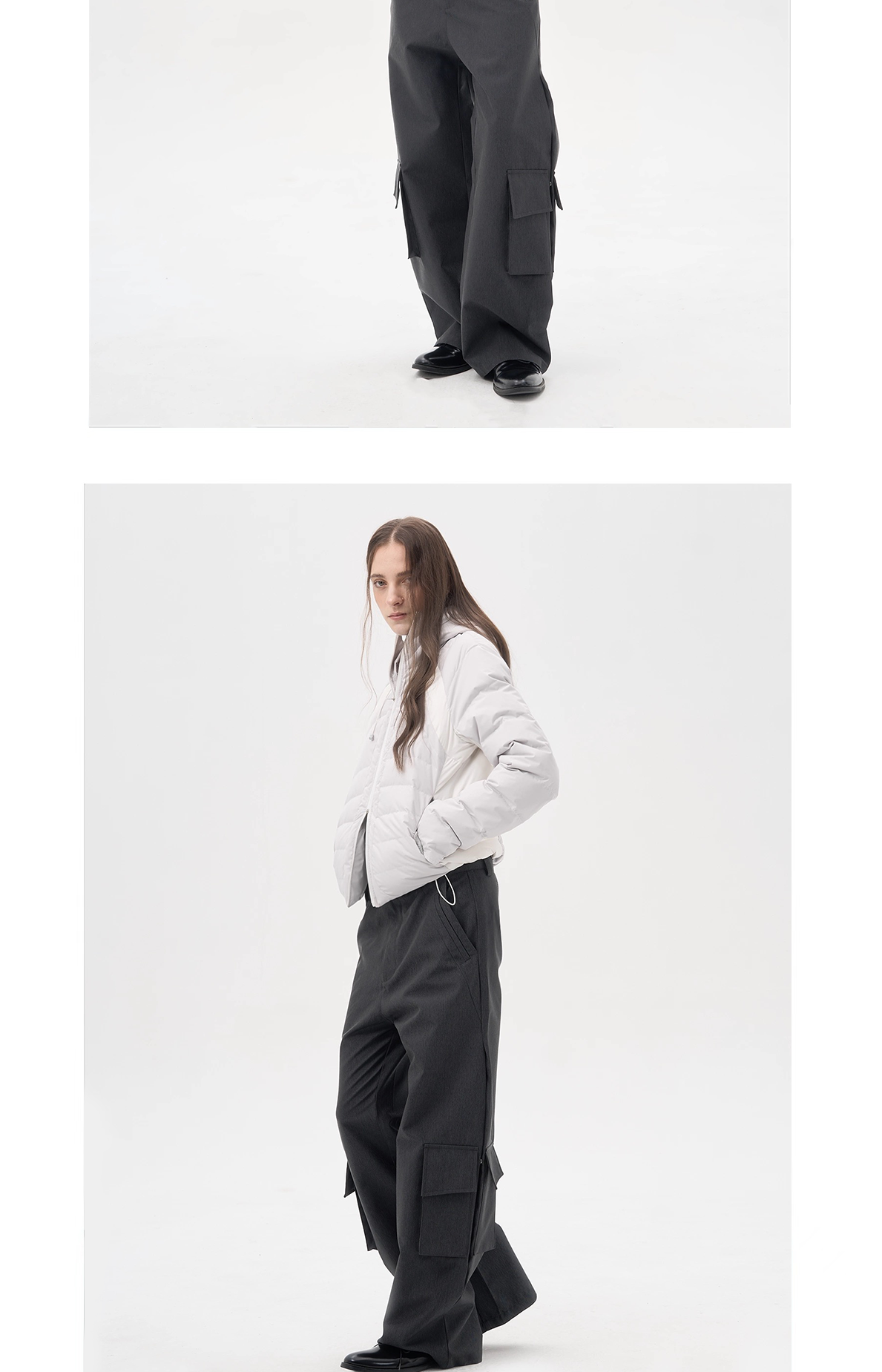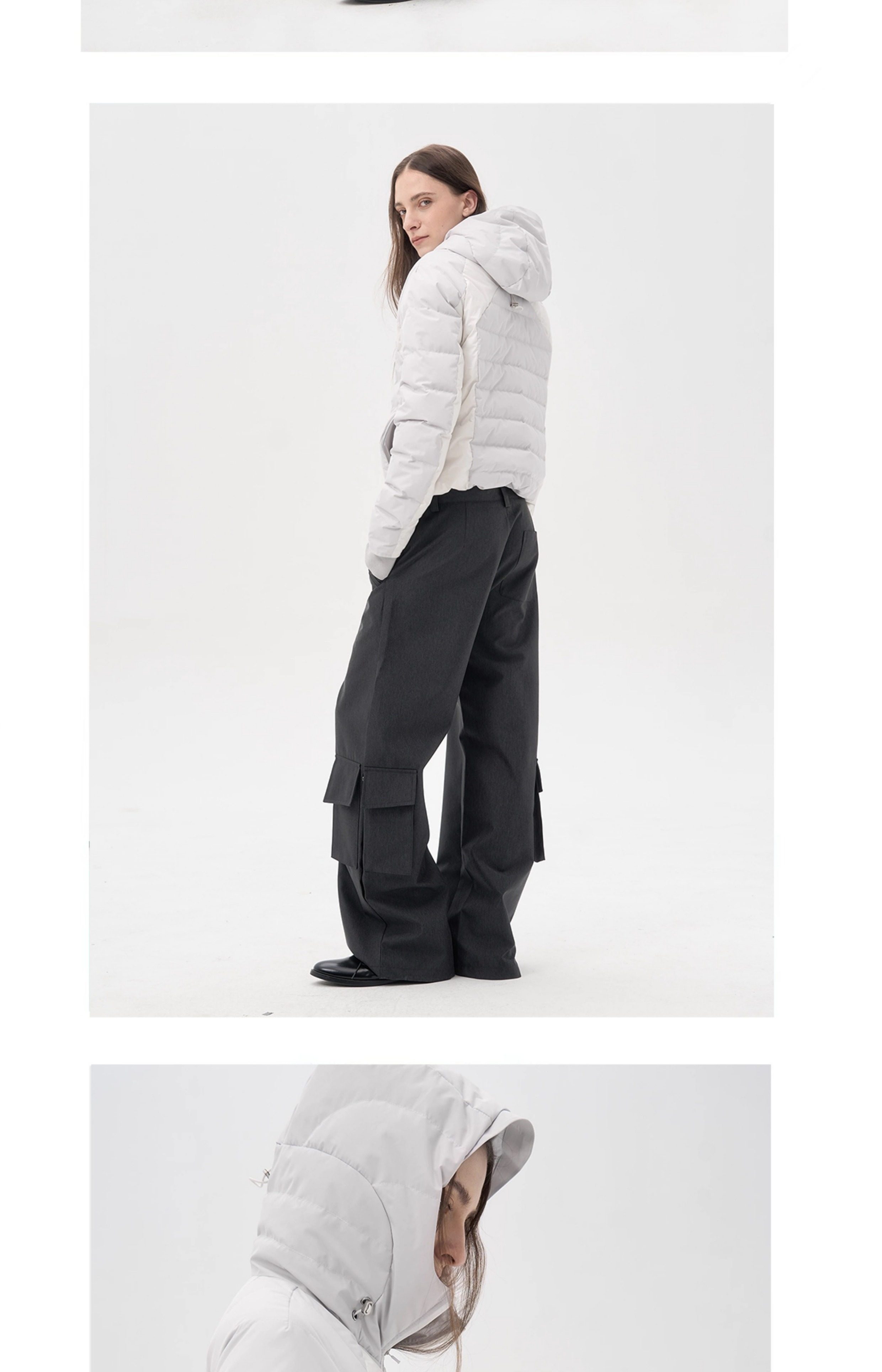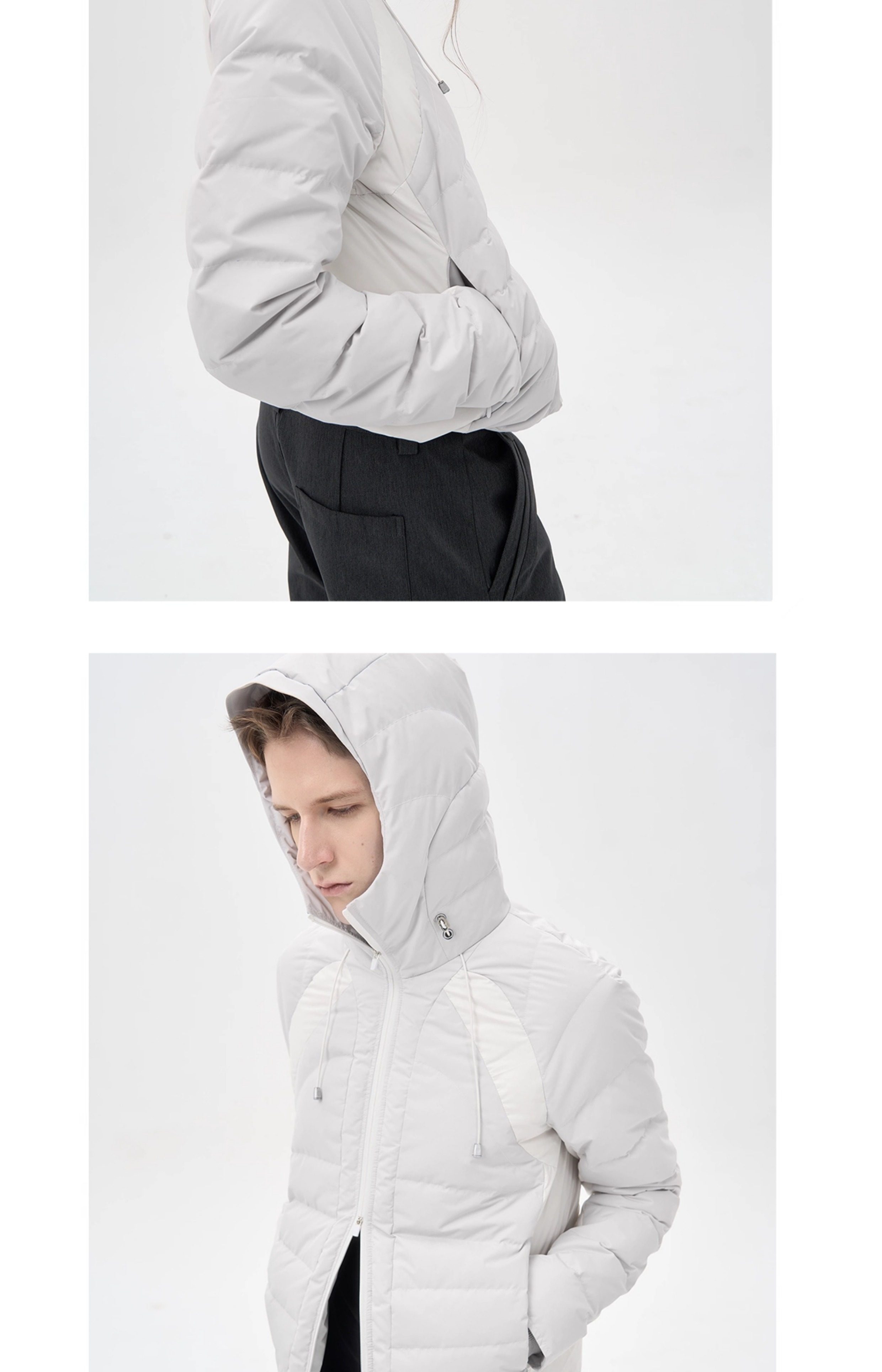Crafted from 100T high-density coated polyester fabric in light gray or off-white, this jacket is water-resistant and windproof. It features a distinctive ribbed quilting design filled with 90% white duck down for efficient warmth without bulk.